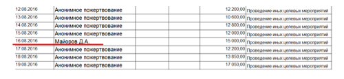 Бывают дни, обычно один-два в месяц, когда кроме Майорова Д.А. фонду "Время" никто не жертвует - например, 16 августа 2016 года: