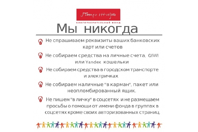 Тем более, что "офферта" (орфография оригинала сохранена) на сайте говорит только о программе "Дети цветы жизни", но ссылка на программу на сайте не работает. По сути, люди жертвуют на сайте неизвестно на что. И поскольку «офферта» говорит только о перечислениях на счёт фонда «Время», собранные на улицах наличные средства в принципе не подлежат отчётности, а сборщики – никакой ответственности, кроме моральной.